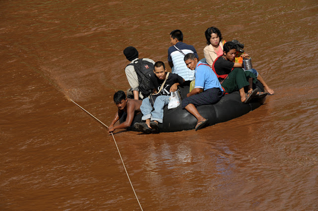 Refugiados do Mianmar atravessam ilegalmente a fronteira com a Tailândia em Mae Sot. Campos montados na fronteira já são o lar de mais de 140.000 pessoas. Entre eles, vive a maioria da etnia Karen, que fugiu do seu país na década de 1990 por consequência de uma grande ofensiva do exército do governo de Mianmar contra a União Nacional Karen.