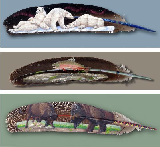 Julie Thompson passou grande parte da sua vida no Alasca. Usufruindo de um cenário natural único e inspirador, que está presente no seu trabalho artístico, começou a pintar penas em 1990, na tentativa de reutilizar as penas que os pavões de sua mãe perdiam em certas épocas do ano. Conhecedora de técnicas de desenho a caneta, pois Julie trabalhou como ilustradora numa empresa de arqueologia, depressa descobriu que os traços pequenos e finos se adaptavam bem às penas. Entusiasmou-se com a ideia, pois nunca vira penas pintadas e pensou que seria um trabalho original e gratificante. A pintura das penas, onde ela retrata animais e pessoas é um trabalho moroso, chegando a demorar algumas semanas para concluir uma única peça. Julie vive atualmente na região de Puget Sound, Washington, com o marido e dois filhos e não há outro lugar onde gostasse tanto de morar...